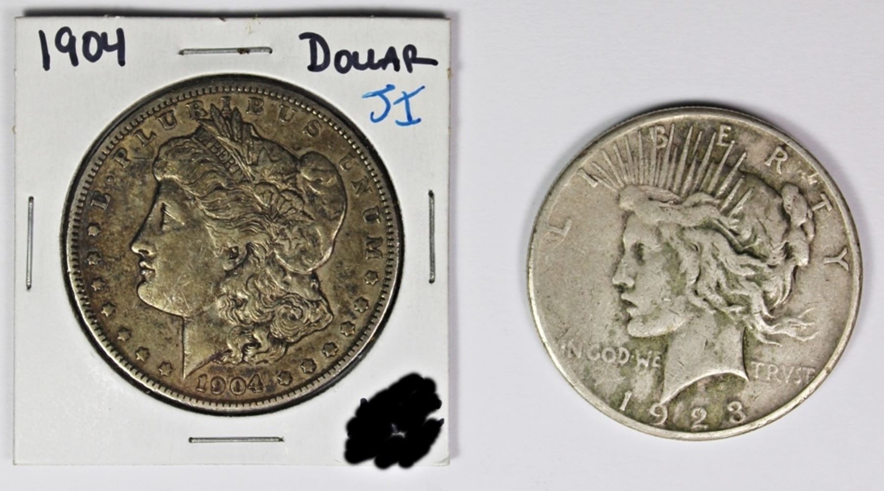 1923 PEACE SILVER DOLLAR WITH RED STICKER A GIVE-A-WAY FROM A CLUB AND A 1904 MORGAN SILVER DOLLAR XF-AU. ESTIMATE: $75-$100