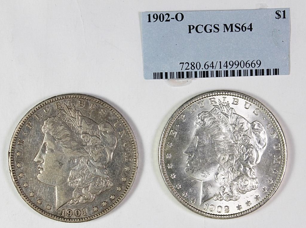 1901-S XF ORIGINAL AND 1902-O MS 64 (PCGS CERT). ESTIMATE: $120-$150