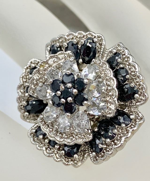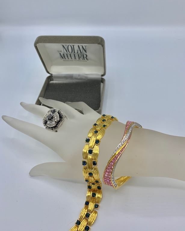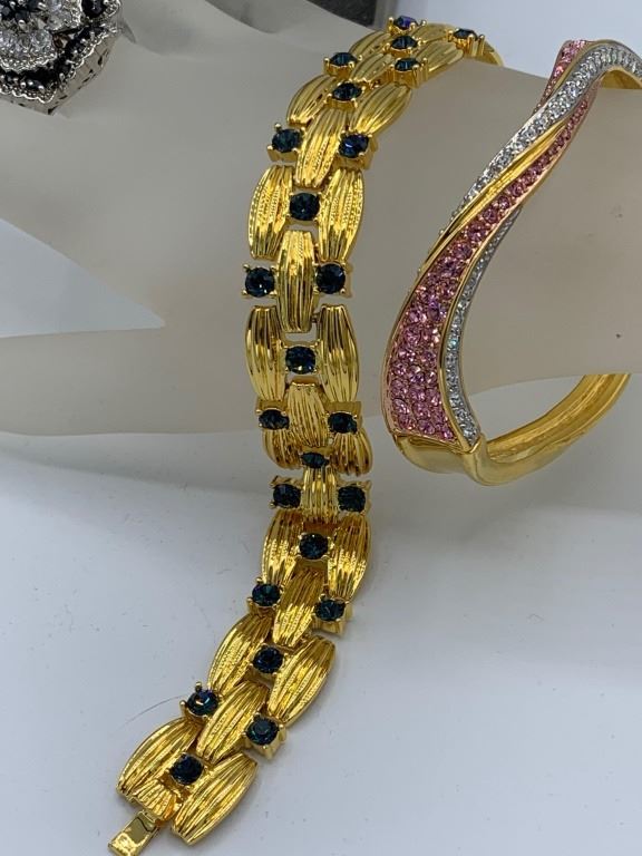 BLACK + WHITE RHINESTONE RING SIZE 9.5, GOLD TONE BRACELET WITH DARK BLUE RHINESTONES + GOLD TONED HINGED BRACELET WITH PINK + CLEAR RHINESTONES. WILL FIT 8" WRIST. PRE-OWNED. ESTIMATE:$100-$125