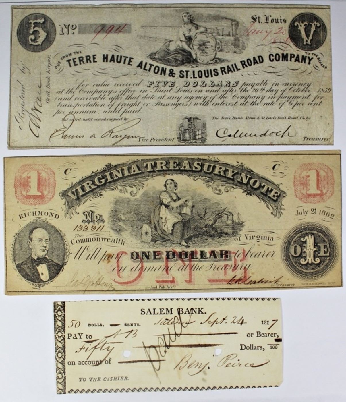 1862 $1.00 VIRIGINA TREASURY NICE, $5.00 TERREHAUTE AND ST. LOUIS RAILROAD 1859; 1817 CHECK SALEM BANK, SALEM, MASS. 3 PIECES TOTAL. ESTIMATE: $300-$400