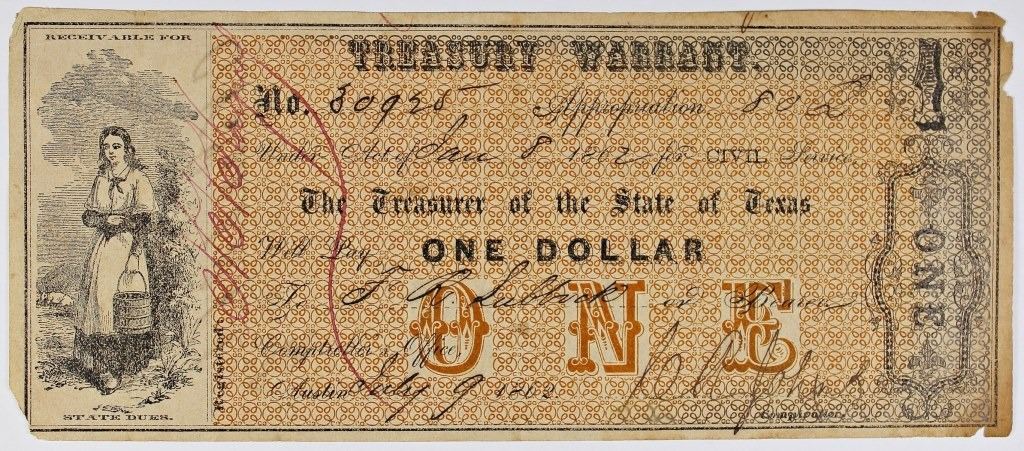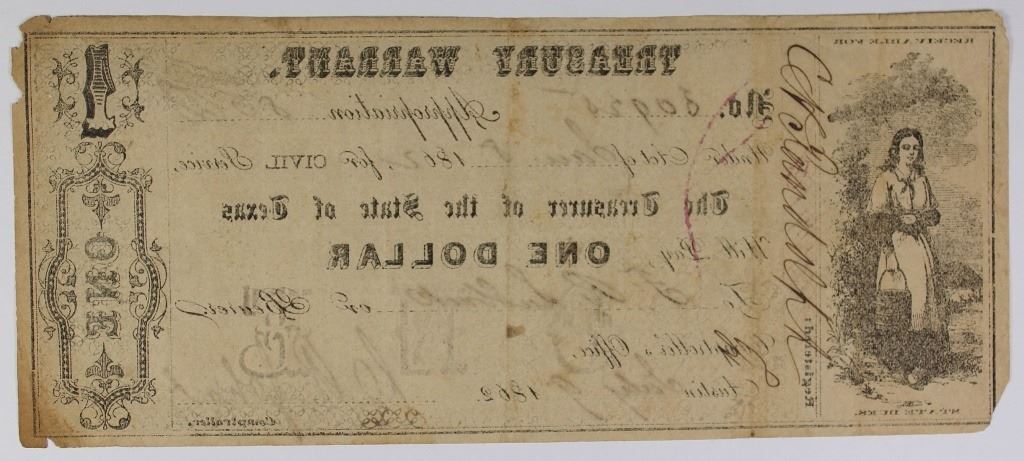 TREASURY WARRANT TEXAS 1862 VF SLIGHT FOXING AT EDGE. A GREAT ITEM. ESTIMATE: $250-$300