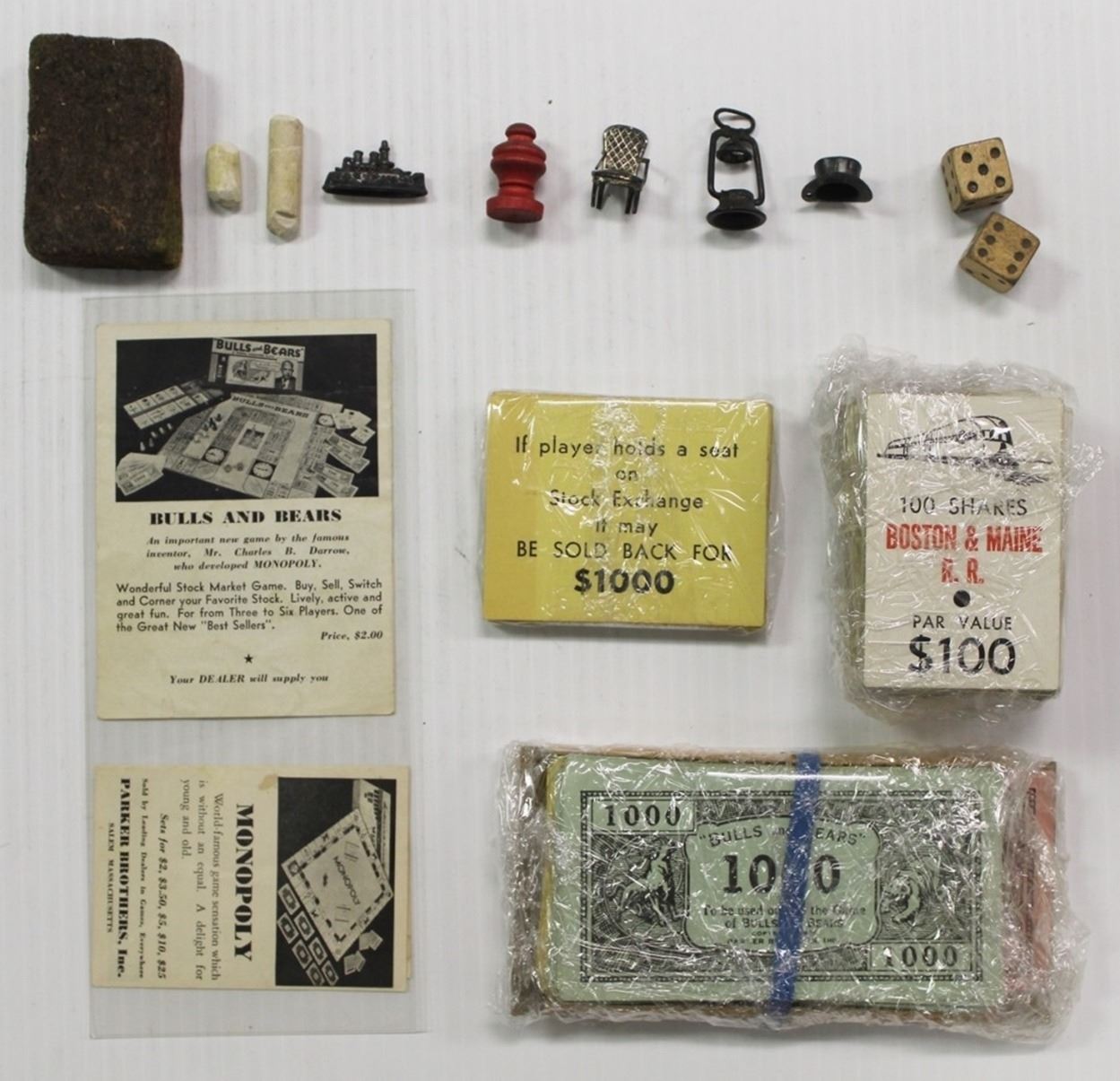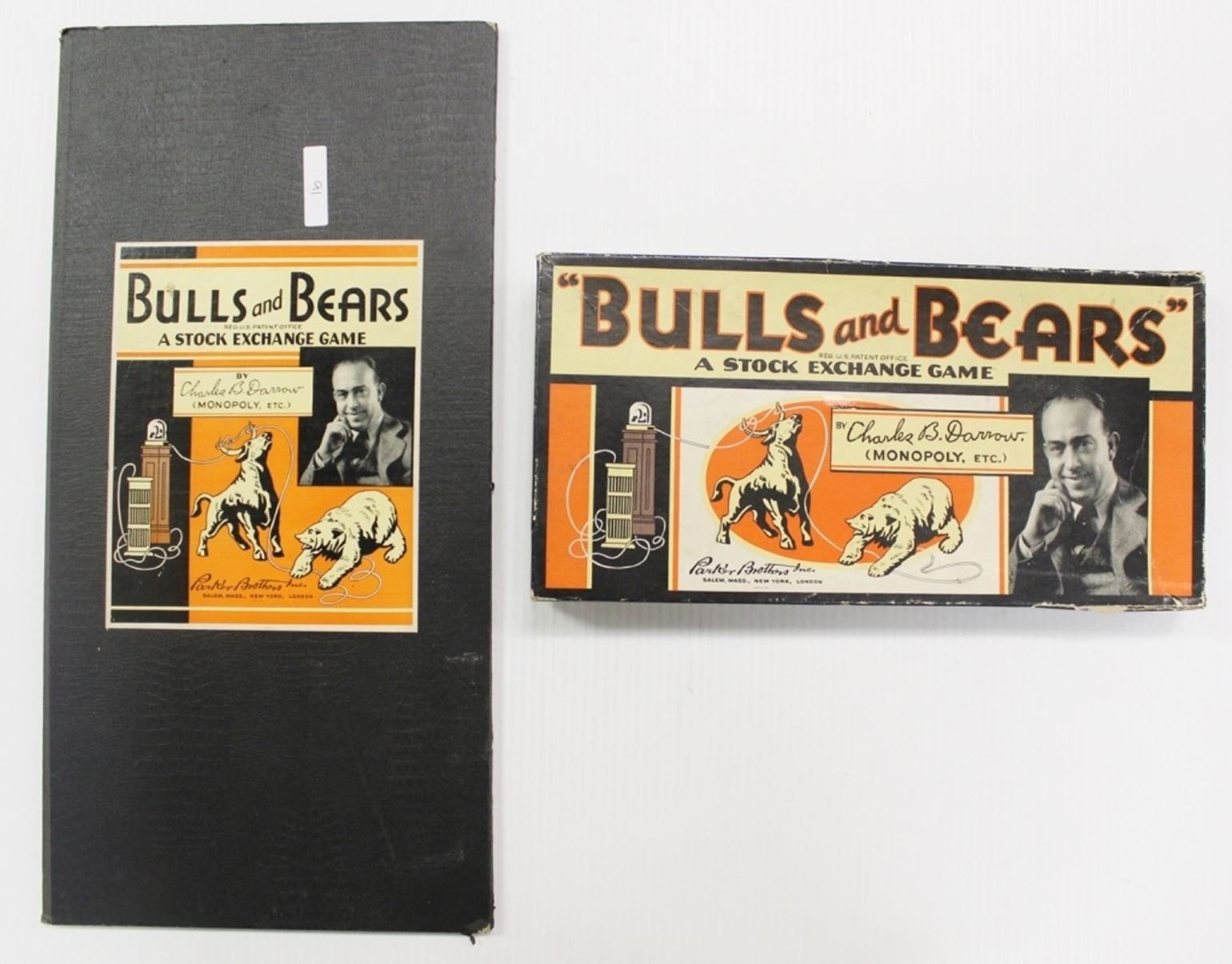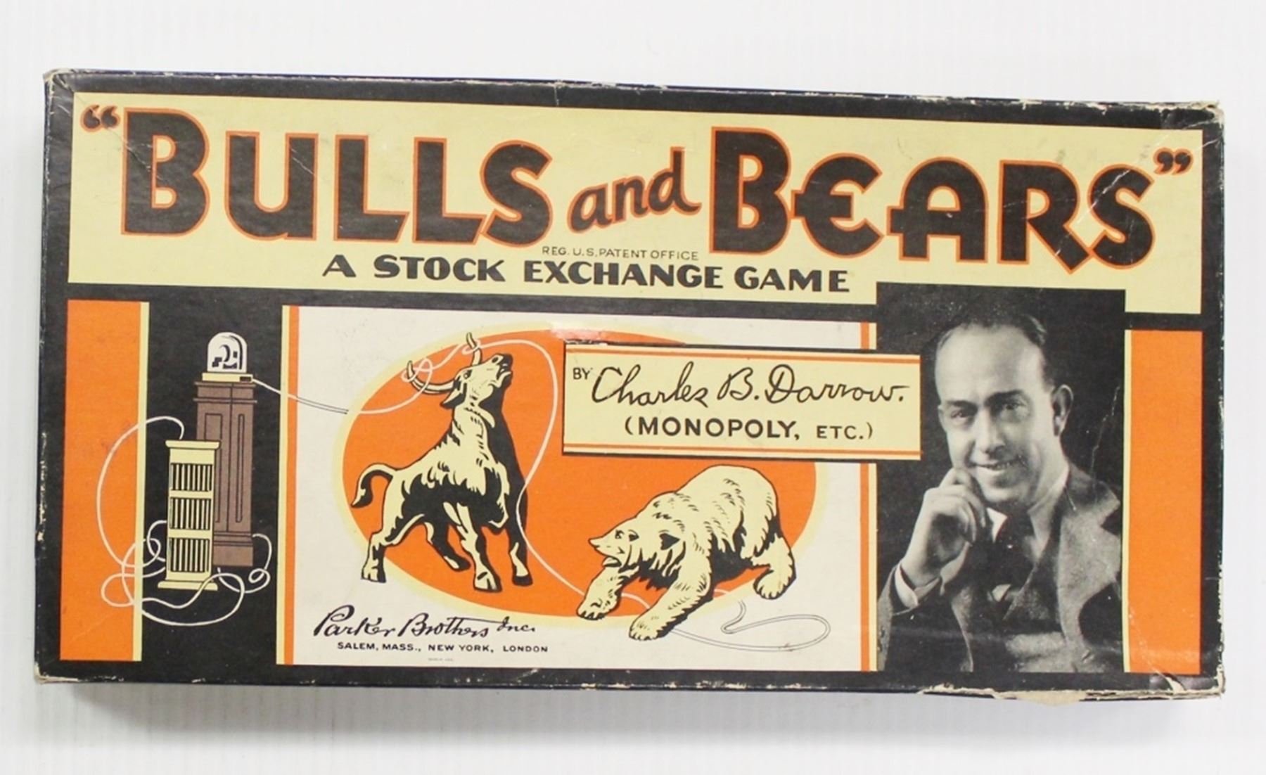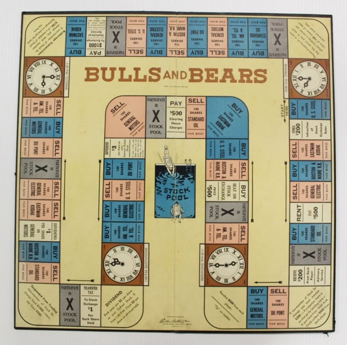 1836 BULLS AND BEARS "STOCK EXCHANGE GAME". NEW YORK. SETUP SIMILAR TO MONOPOLY BUT INSTEAD OF PROPERTIES TO BUY THERE ARE STOCKS TO BUY AND SELL. FINE CONDITION. ORIGINAL BOX AND PIECES APPEAR COMPLETE. OUTTER BOX HAS SOME WEAR AND TEAR AS EXPECTED OVERALL EXCELLENT CONDITION. ESTIMATE: $300-$400