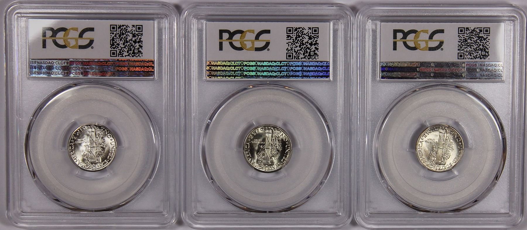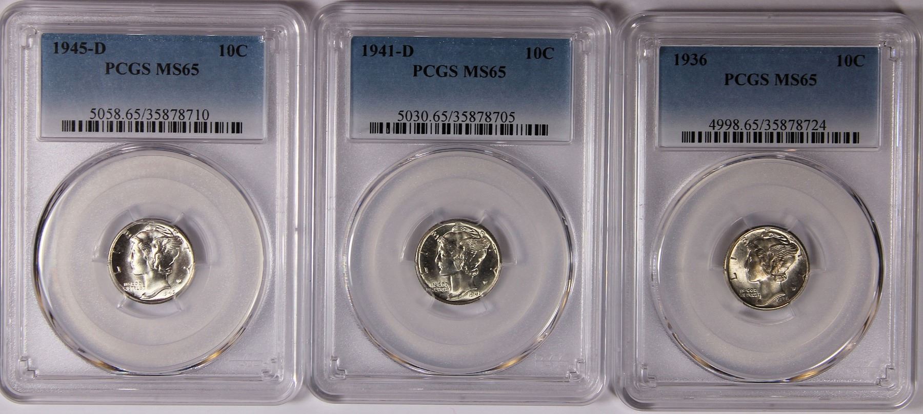 PCGS GRADED MERCURY DIMES: ALL MS 65 WHITE - 1945-D, 1936 & 1941-D