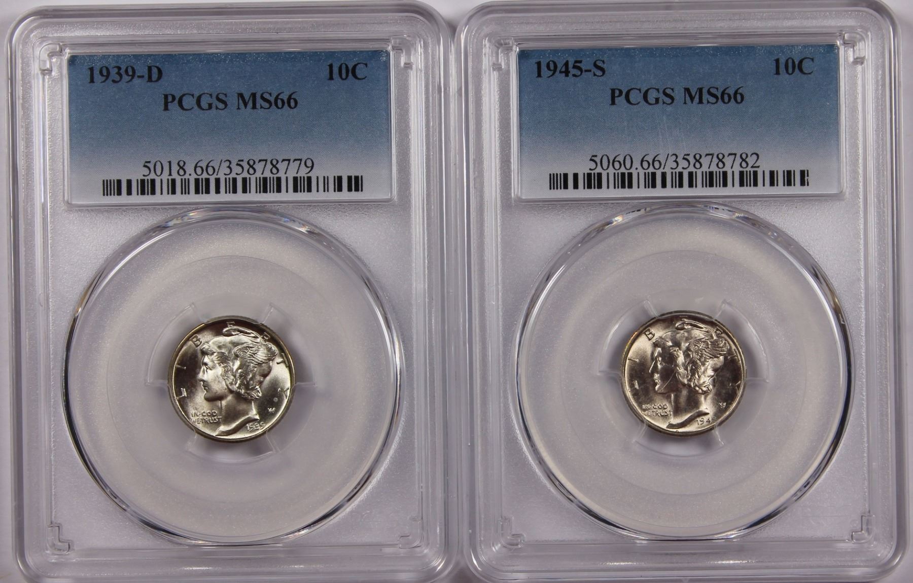 PCGS GRADED MERCURY DIMES MS 66 : 1939-D & 1945-S. ESTIMATE: $85-$125