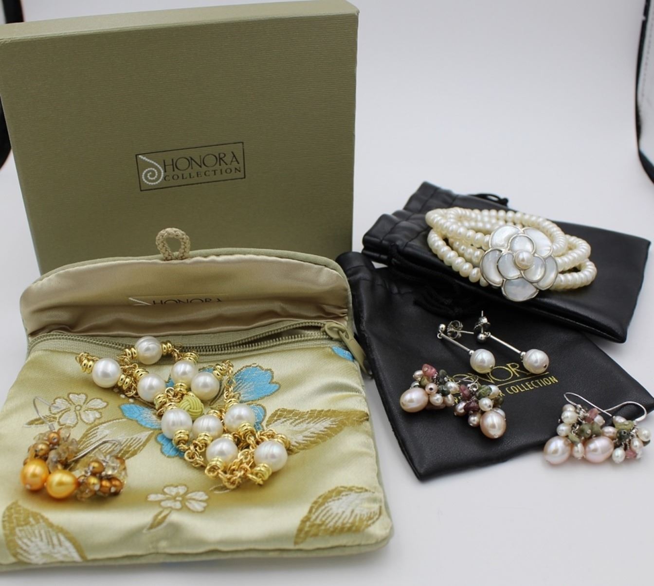 4 PAIRS OF EARRINGS, BRACELET AND NECKLACE. ESTIMATE: $150-$200