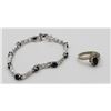 DEEP SAPPHIRE COLORED STONES AND STERLING SILVER BRACELET AND RING SET. RING IS A SIZE 7.5 BRACELET IS 7.5" LONG. 13.4 GRAMS TOTAL. PRE-OWNED. ESTIMATE: $100-$125