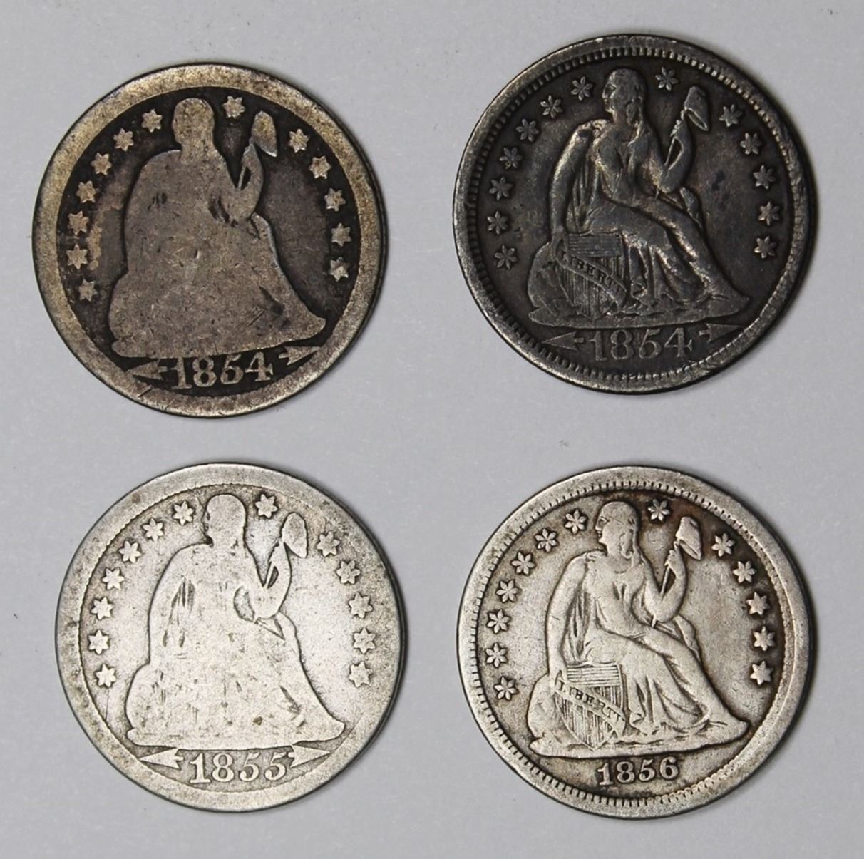 SEATED DIMES: 1854 ARROWS VF, 1854-O ARROWS GOOD, 1855 ARROWS GOOD, 1856 FINE SMALL DATE. ESTIMATE: $85-$100