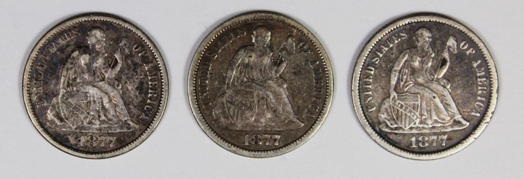 SEATED DIMES: 1877 VF, 1877-CC VF AND 1877-S VF. ESTIMATE: $95-$115