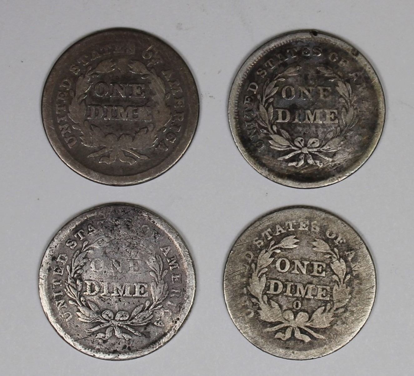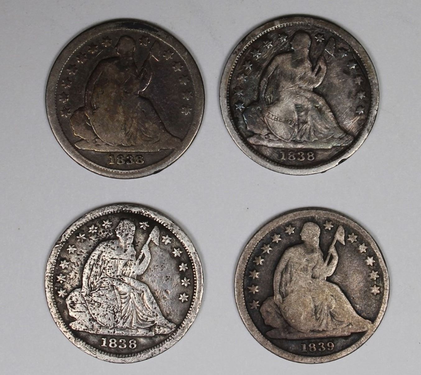SEATED DIMES: 1838 SMALL STARS VG, 1838 LARGE STARS GOOD, 1838 PARTIAL DRAPERY G-VG AND 1839 GOOD. ESTIMATE: $80-$100