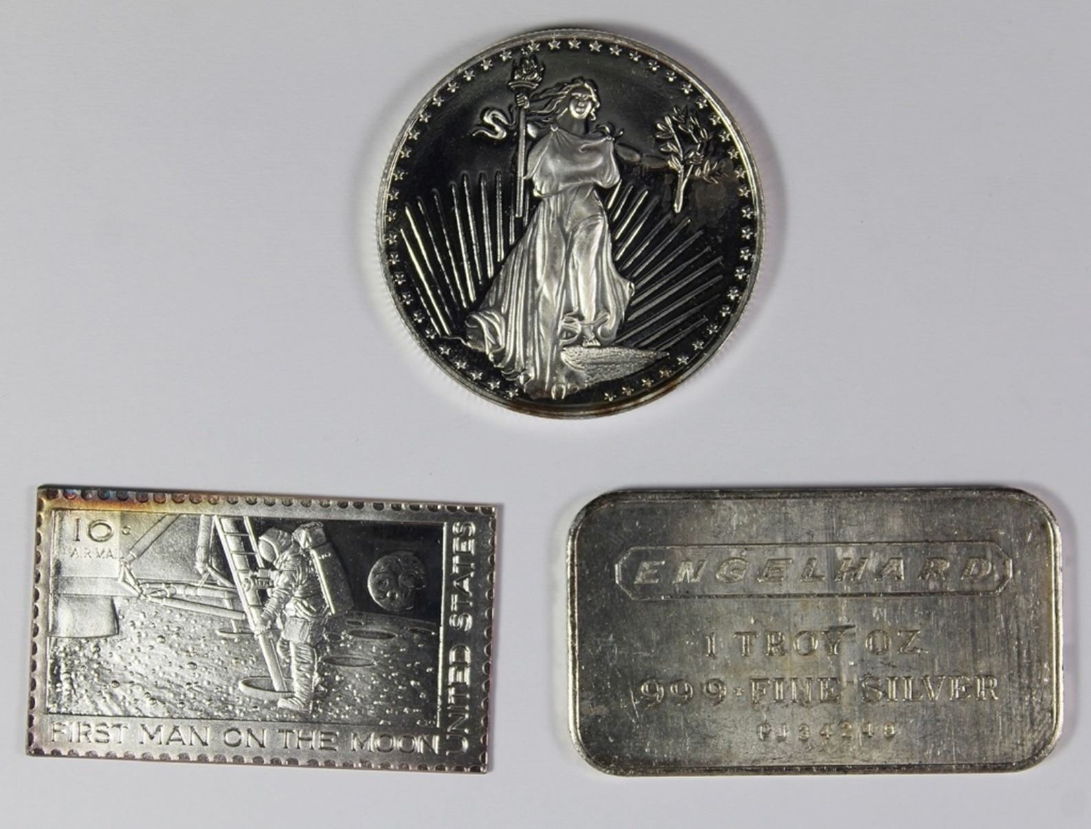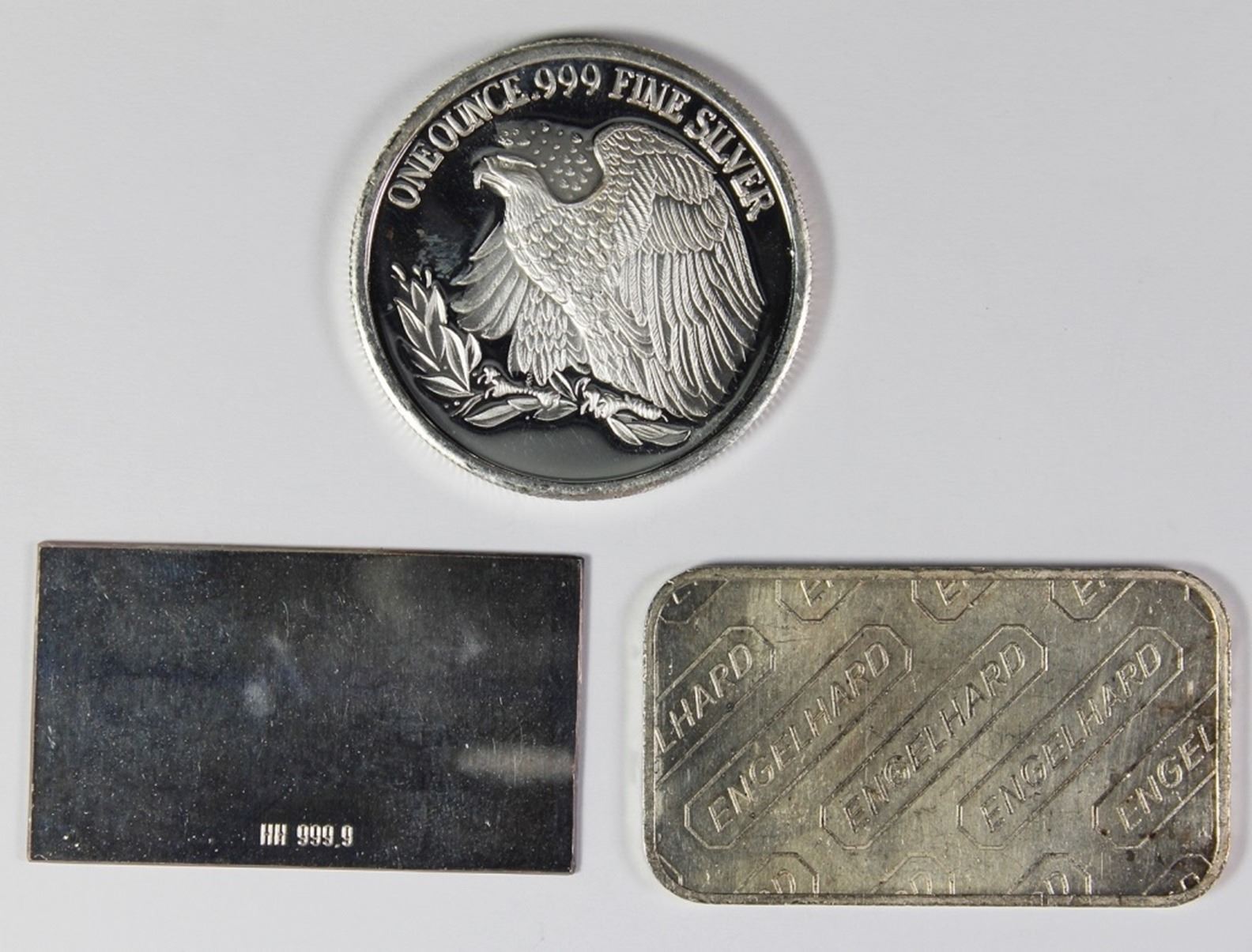 1/2 OZ SILVER BAR, 1 OZ ROUND, AND 1 OZ RECTANGLE. ESTIMATE: $65-$100