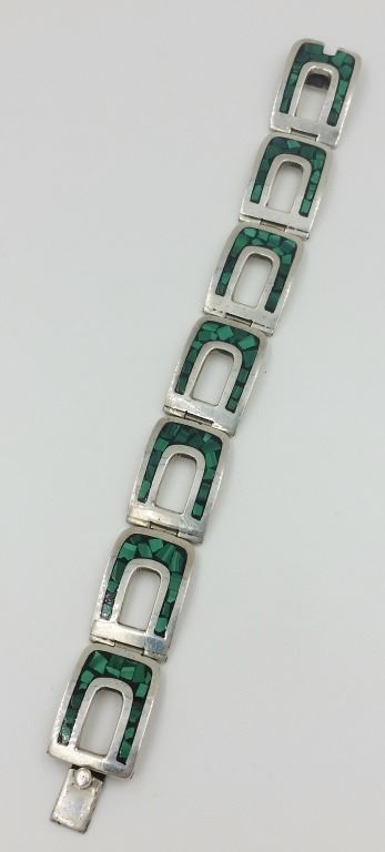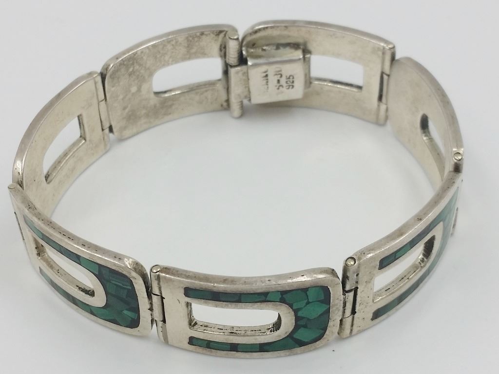 BRACELET WITH GREEN DESIGNS, PRE OWNED. TOTAL OF 46 GRAMS. SEE PHOTO. ESTIMATE: $60-$80