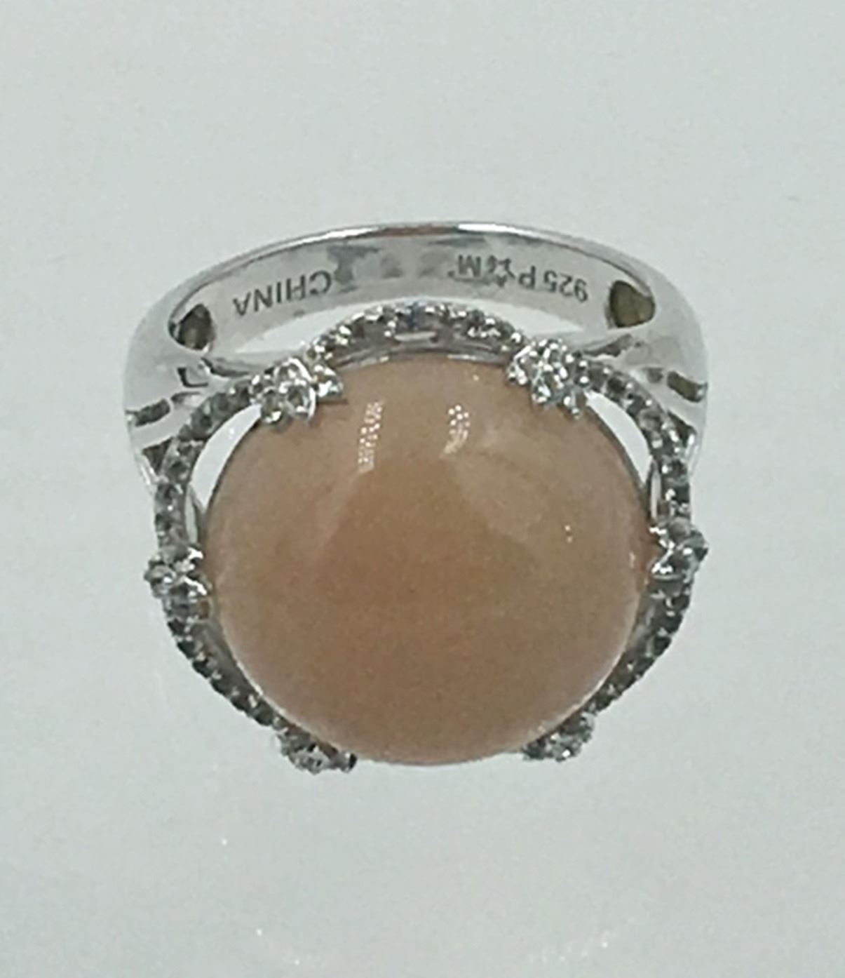 CHAMPAGNE WHITE COLORED STONE. SIZE 9 1/2. STAMPED .925 CHINA. PRE-OWNED. SEE PHOTOS. ESTIMATE: $75-$100