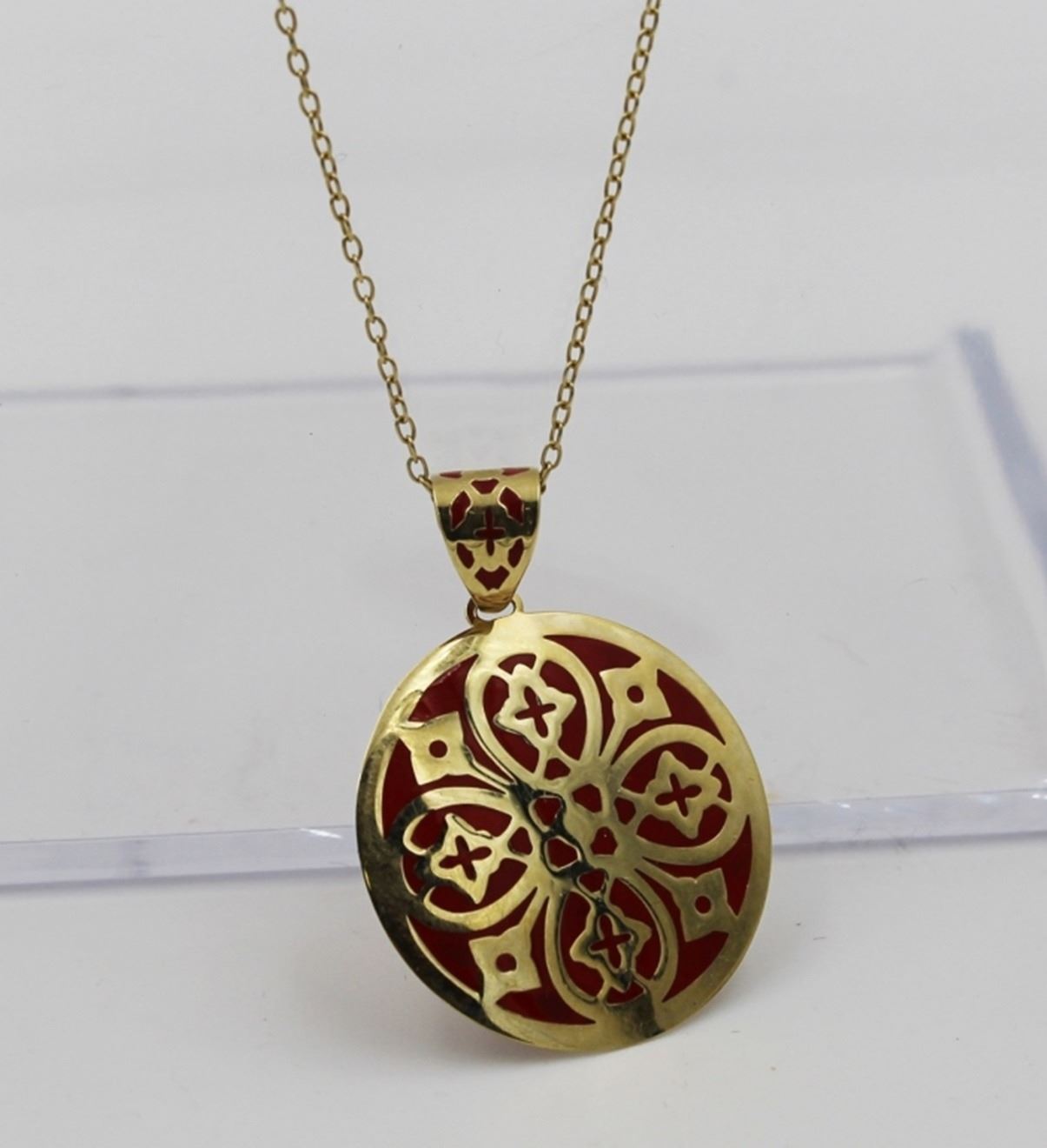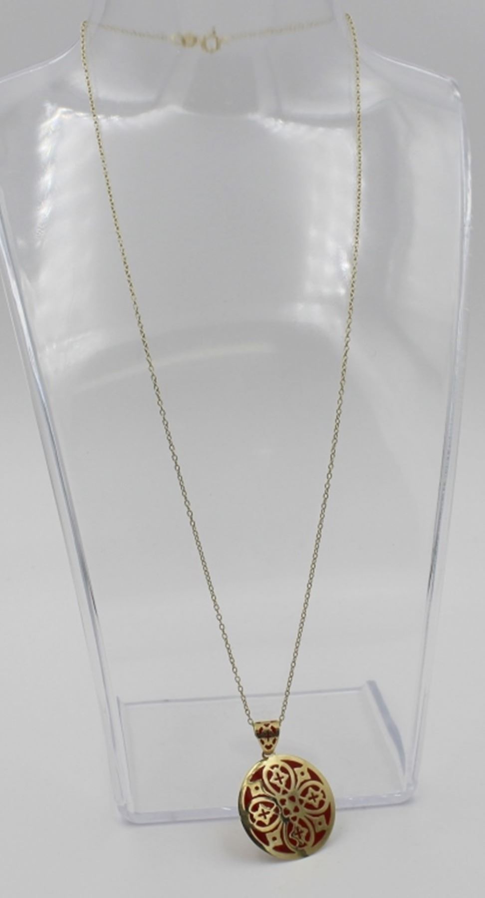 GOLD TONED 18" NECKLACE WITH A 14K GOLD AND RED ENAMEL PENDANT. 3 GRAMS TOTAL. PRE-OWNED. ESTIMATE: $100-$150
