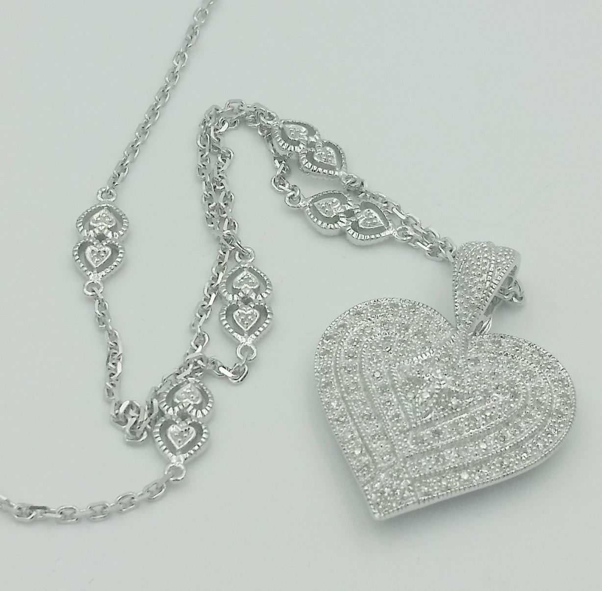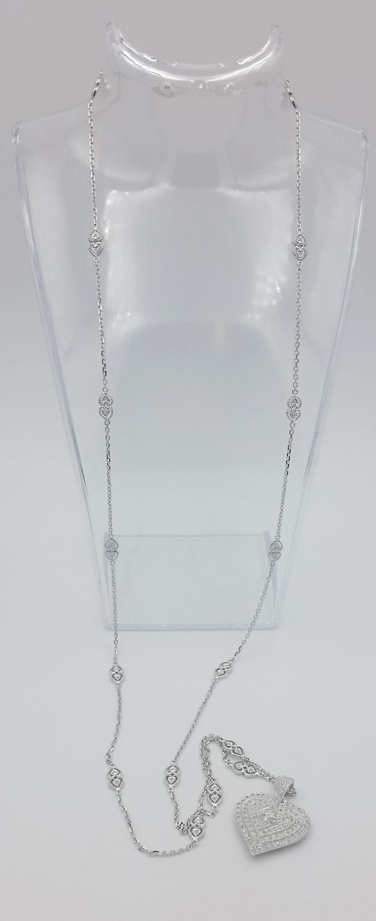 STERLING SILVER HEART PENDANT ON FANCY STERLING SILVER CHAIN. 36" LONG. VERY OMATE EA. CZ's. ESTIMATE:$100-$150