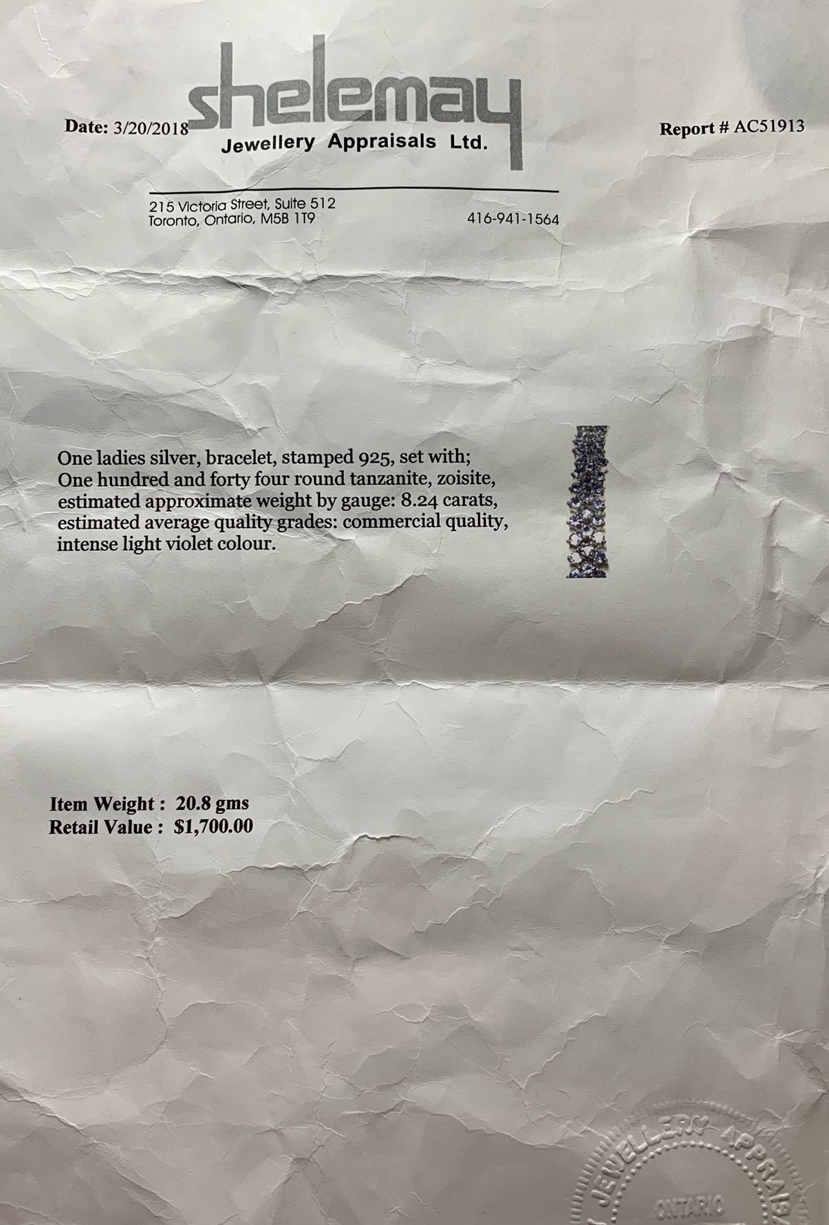 STERLING SILVER 8.24 CT TANZANITE BRACELET WITH APPRAISAL. ONE LADIES SILVER BRACELET STAMPED .925, SET WITH ONE HUNDRED AND FORTY ROUND TANZANITE AND ZOISITE. ESTIMATED APPROZIMATE WEIGHT BY GUAGE: 8.24 CARATS, ESTIMATE AVERAGE QUALITY GRADES, COMMERICIAL QUALITY INTENSE LIGHT VIOLET COLOR. APPRAISED RETAIL VALUE: $1,700.00!!! ESTIMATE: $750-$900