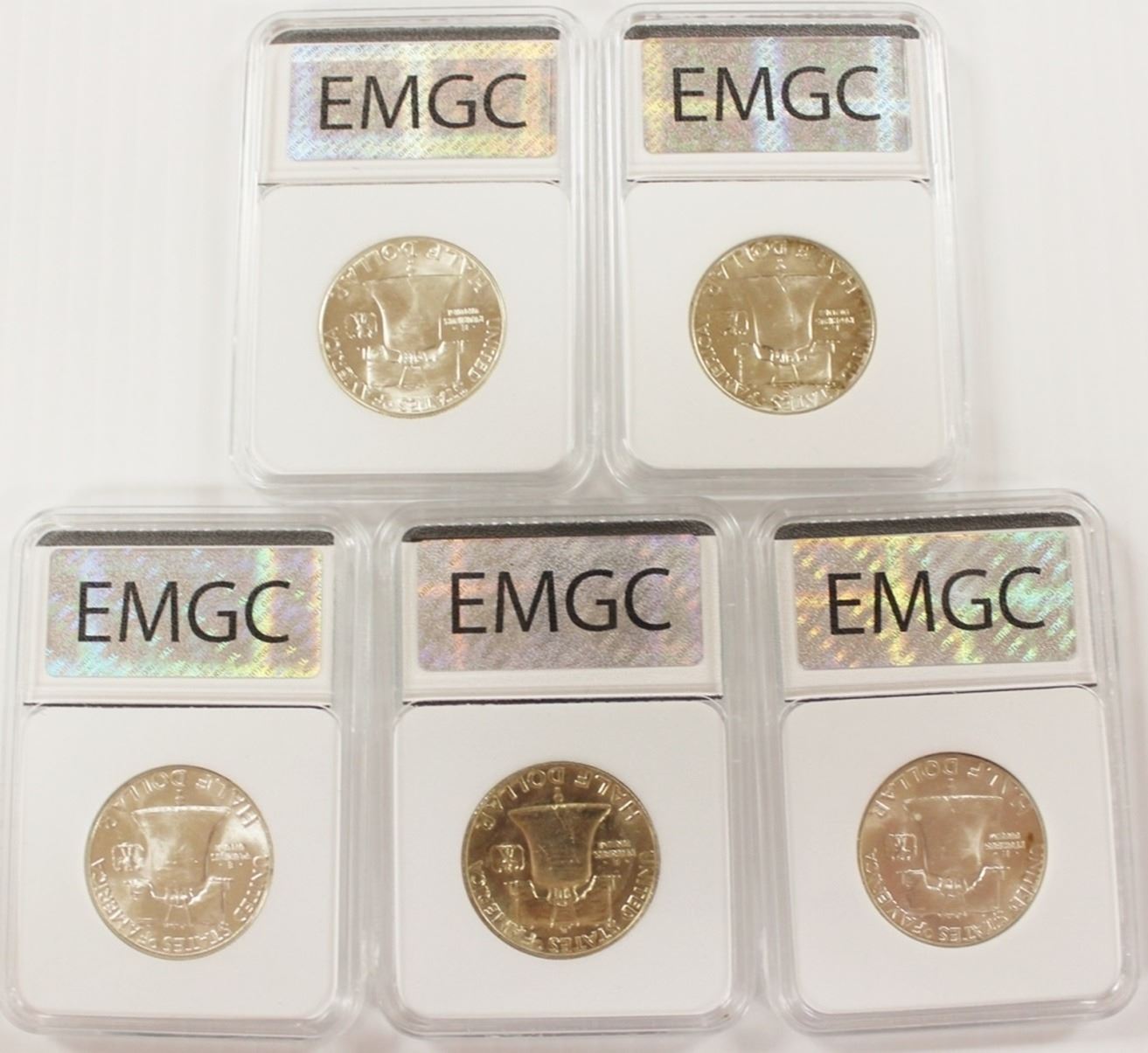 BLAST WHITE. EMGC GRADED. 1960-D, 1958-D, 1960, 1958 AND 1962. FIVE COINS TOTAL. ESTIMATE: $600-$700