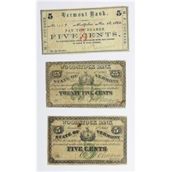 WOODSTOCK FIVE CENT AND TWENTY FIVE CENT AND VERMONT BANK FIVE CENT. VF. WARE. ESTIMATE: $200-$250