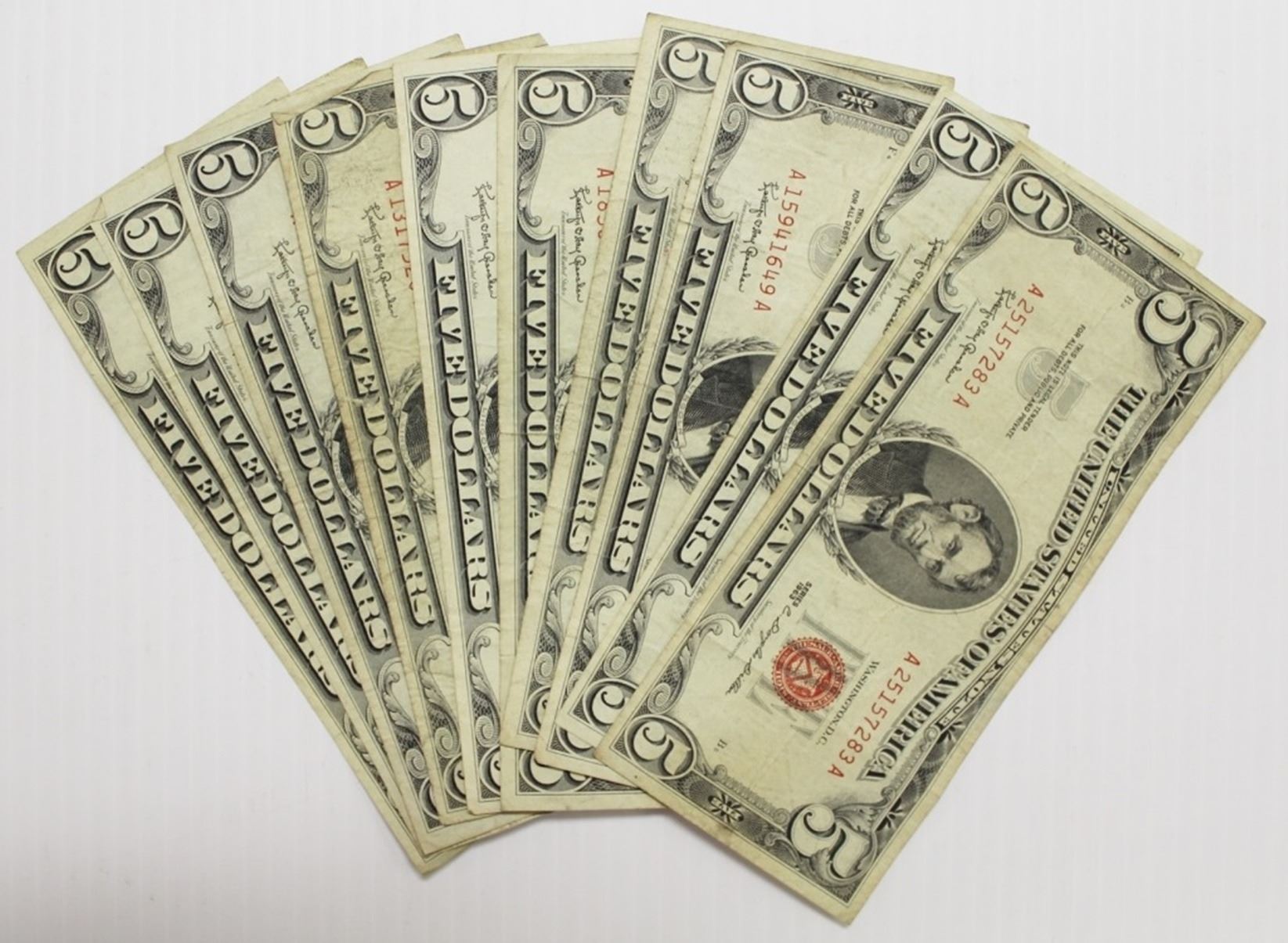 TEN RED SEAL 1963 $5.00 U.S. NOTES