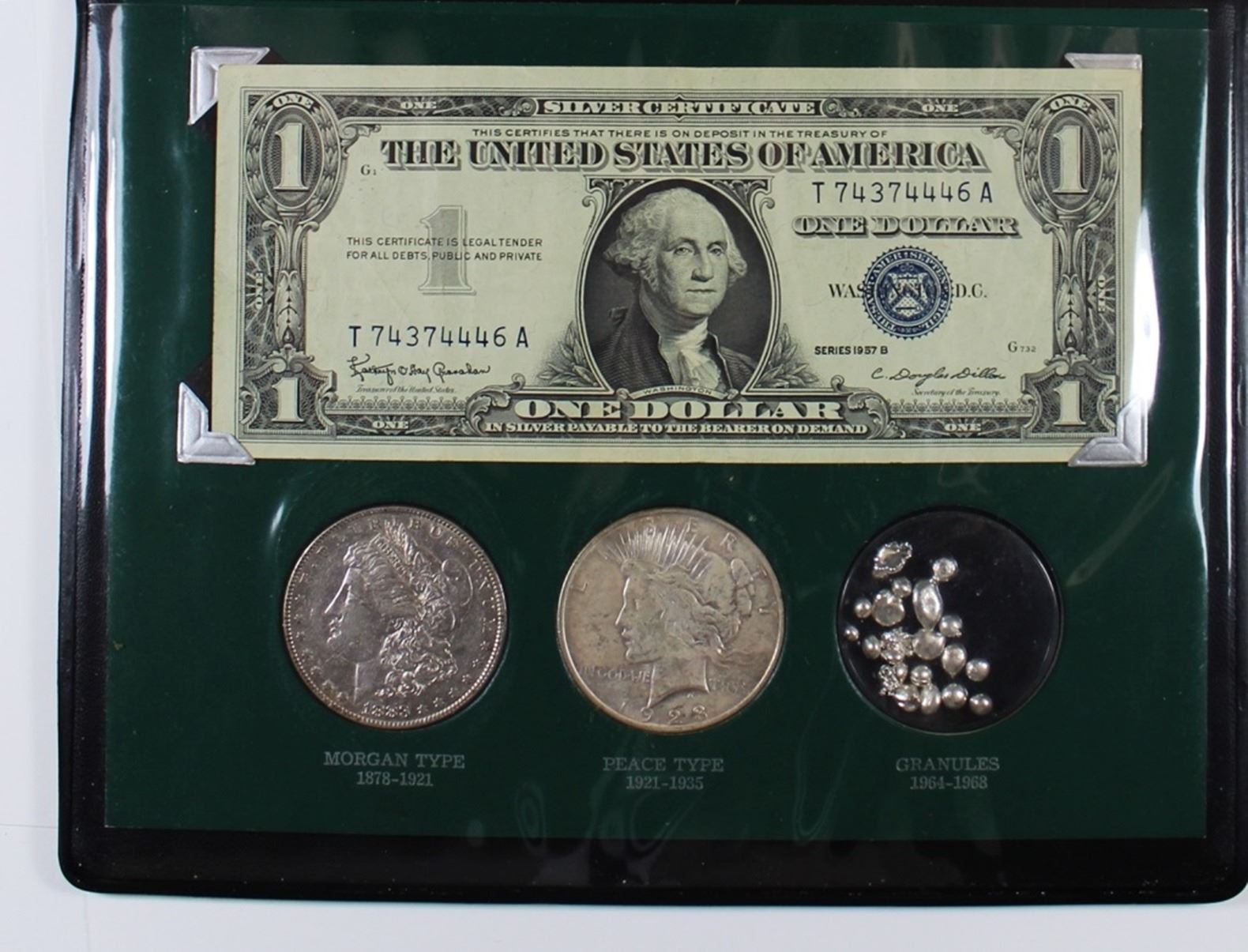 1957 SILVER CERTIFICATE, SILVER GRANULES; U.S. COMMEM GALLERY WITH WALKING LIBERTY HALVES, WASHINGTON SILVER QUARTERS, MERCURY SILVER DIMES, 2011 SET BU. ESTIMATE: $125-$150