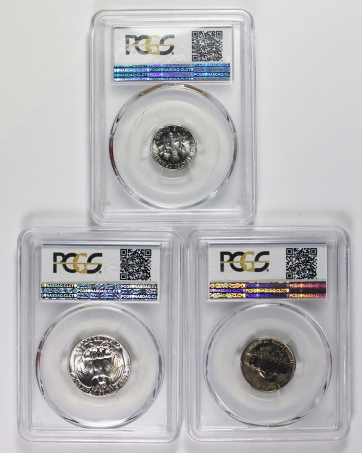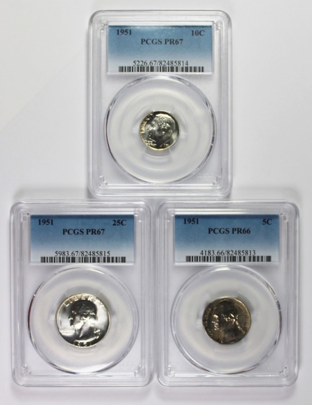 ALL PCGS GRADED: NICKEL PR66, DIME PR67, AND QUARTER PR67. ESTIMATE: $250-$300