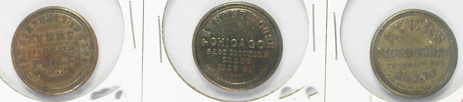 RARE 10 CENTS TREMONT HOUSE CHICAGO XF CASE AND 1 CENT AYERS CATHARTIC PILLS VF CASE WELL CIRC 3 CENTS AYERS SARSAPARILLA FADED STAMP HIGH GRADE CASE. A HIGHLY COLLECTIBLE AND SCARCE TRIO. DIFFICULT TO REPLACE. ESITMATE: $1300-$1500