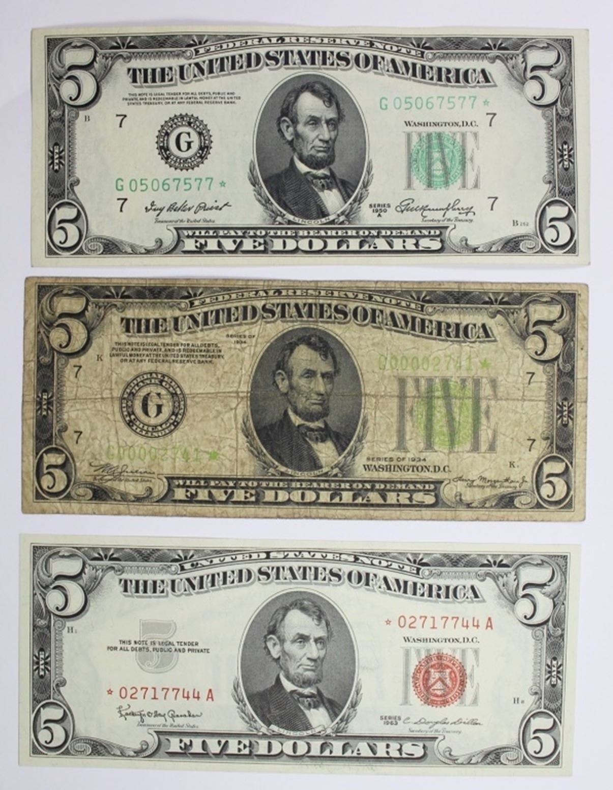 1963 $5.00 GEM UNC,1934 $5.00 FINE, AND 1950-A $5.00 UNC. ESTIMATE: $250-$300