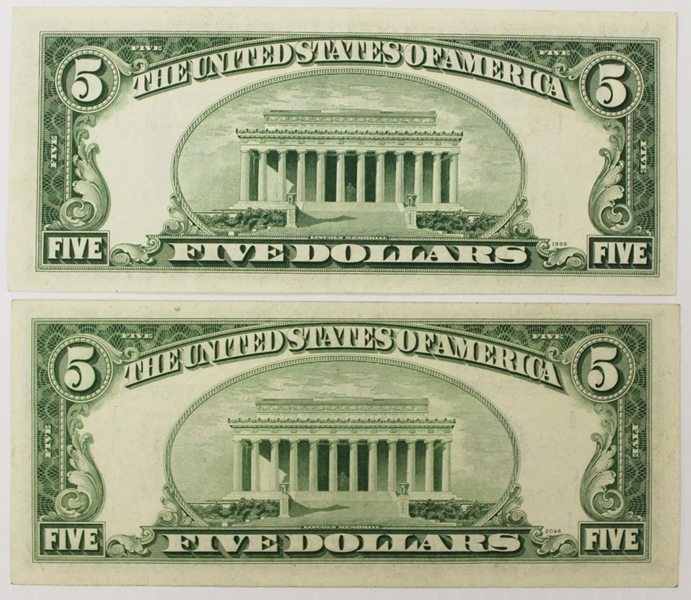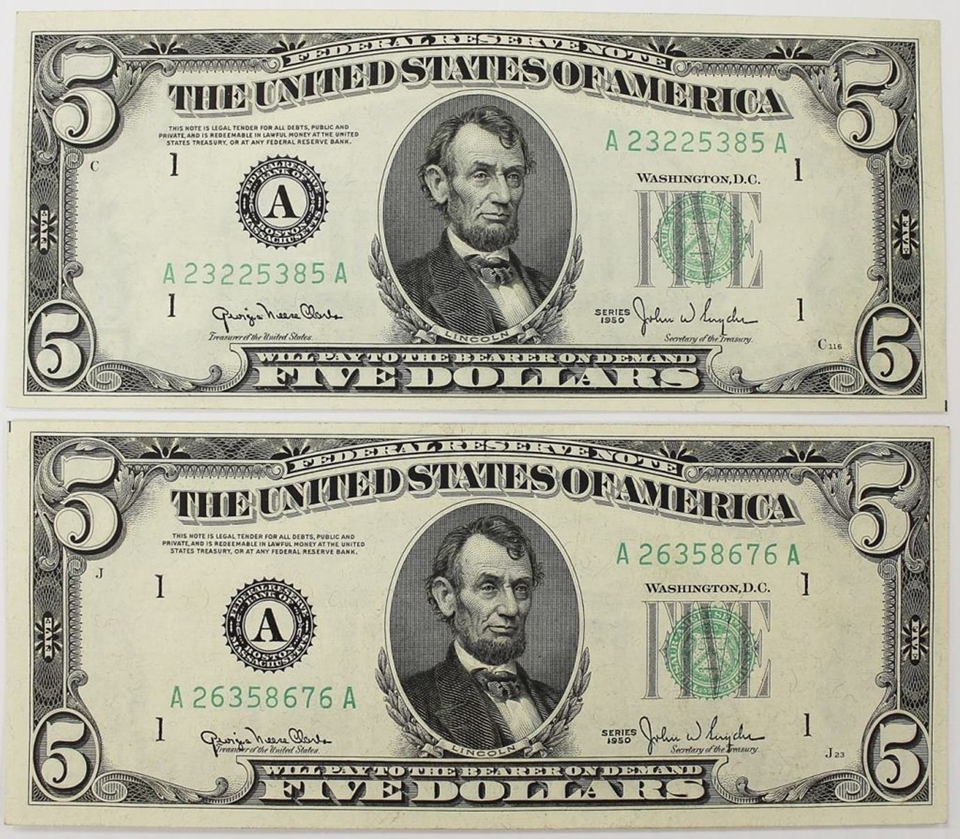TWO 1950 $5.00 BOSTON FEDERAL RESERVE NOTES