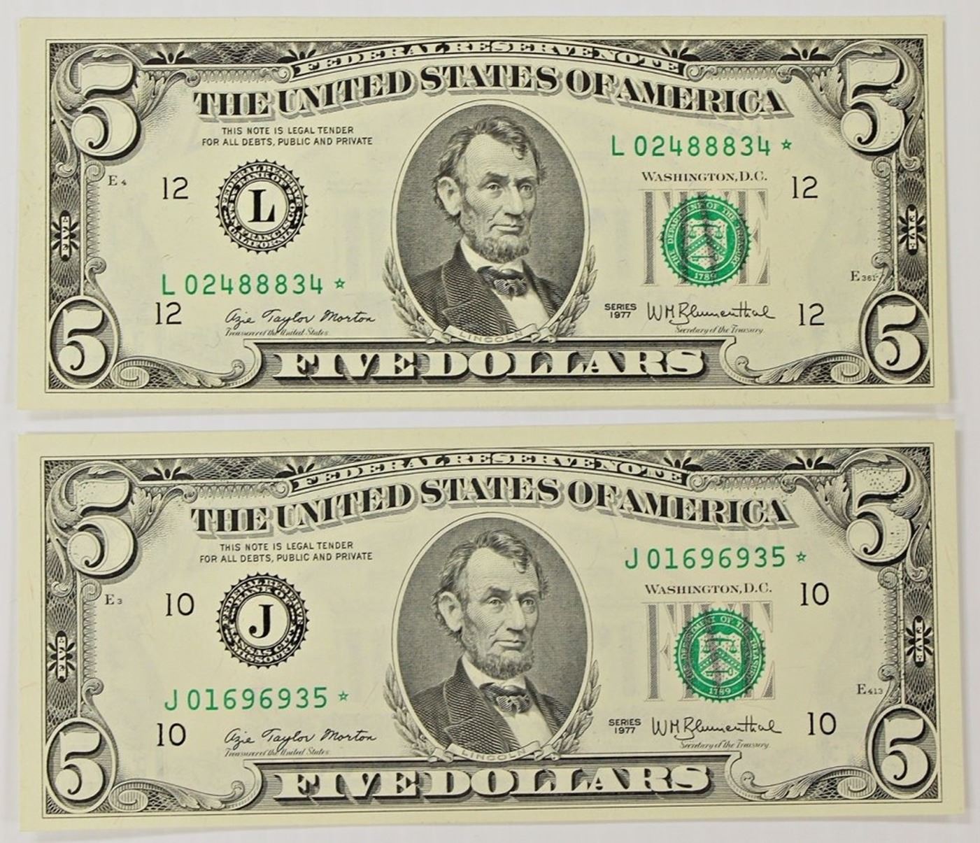 TWO 1977 $5.00 FEDERAL RESERVE  STAR  NOTES