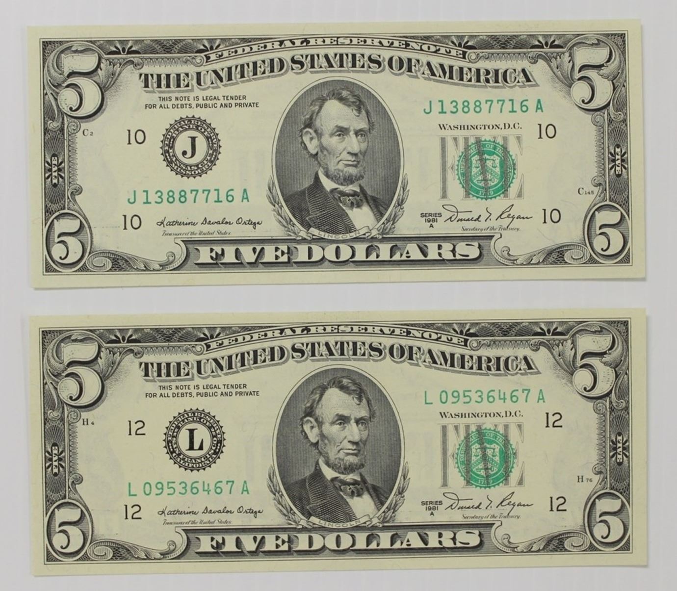 TWO 1981-A $5.00 FEDERAL RESERVE NOTES: