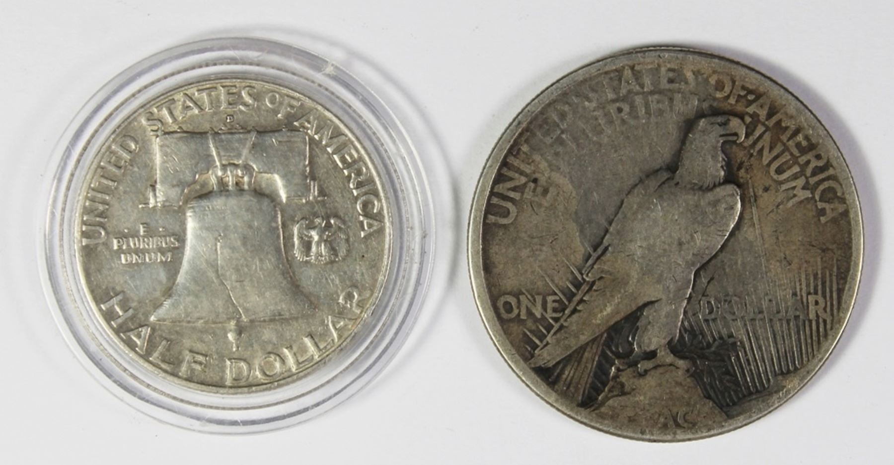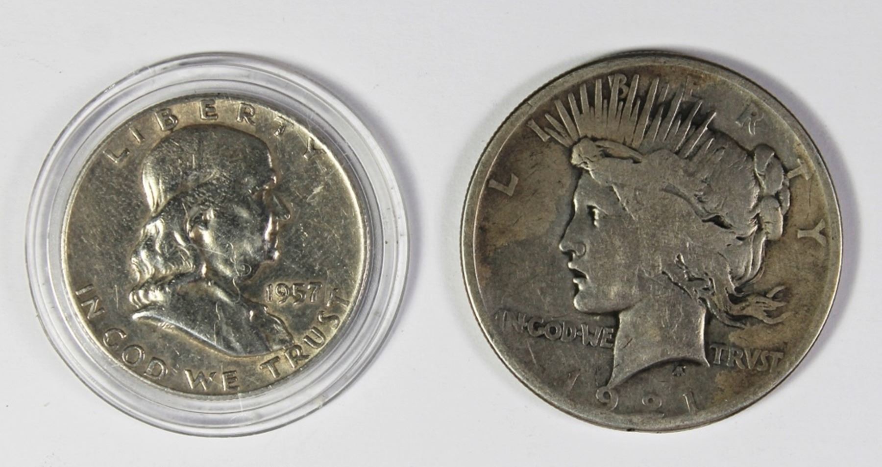 1921 PEACE SILVER DOLLAR VG AND 1957-D HALF DOLLAR. ESTIMATE: $85-$100