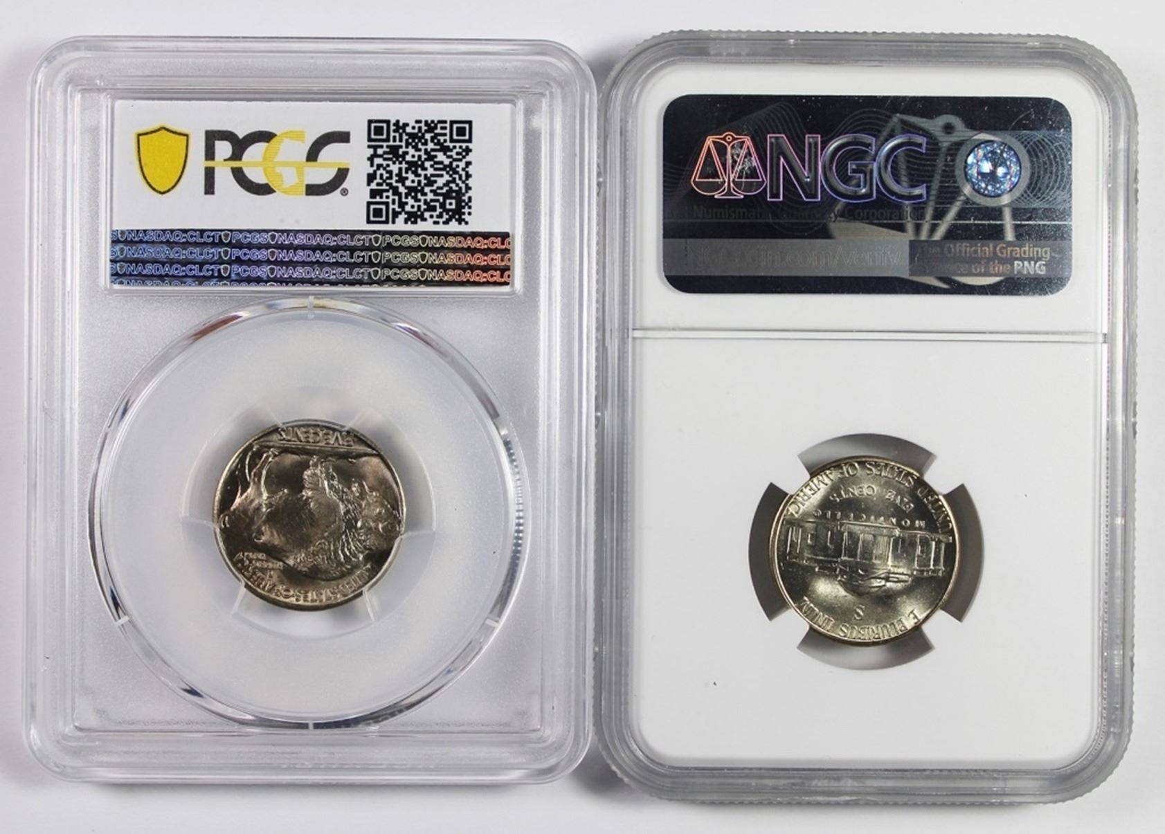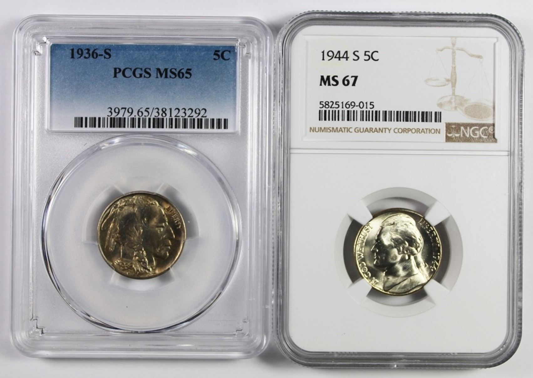 1944-S NICKEL NGC GRADED MS67 AND 1936-S NICKEL PCGS GRADED MS65. ESTIMATE: $125-$175