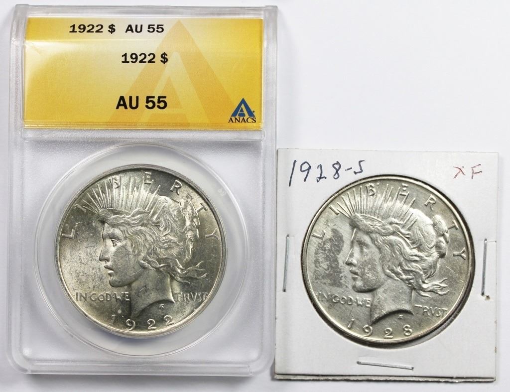 1928-S XF AND 1922 ANACS AU 55. ESTIMATE: $60-$85