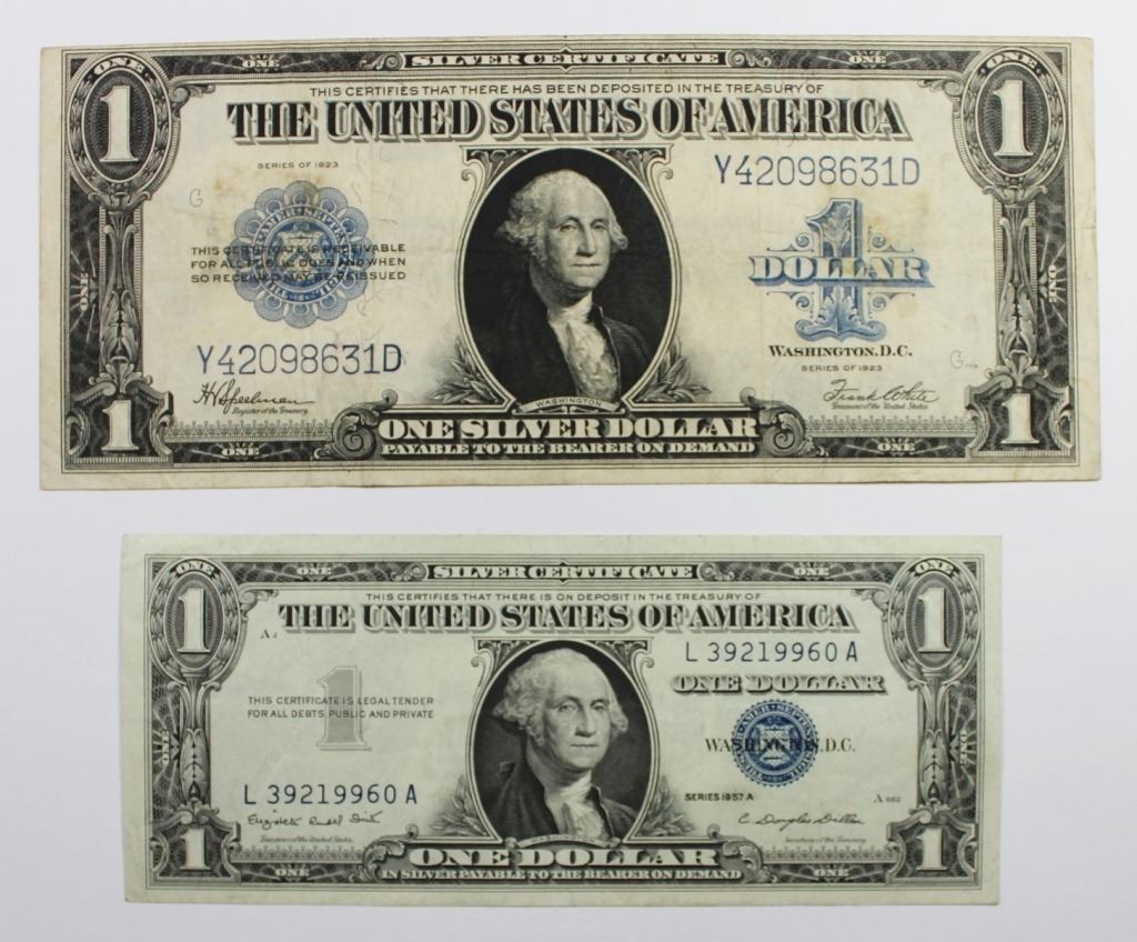 1957 A XF AND 1923 VF. SLIGHT GLUE. ESTIMATE: $50-$75