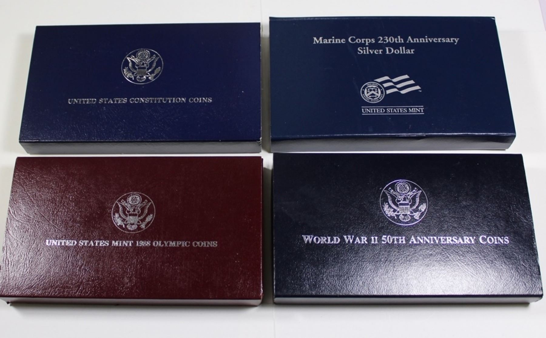 U.S. COMMEMORATIVE SILVER DOLLARS - 1988 OLYMPIC PROOF DOLLAR, 1987 CONSTITUTION PROOF DOLLAR, WORLD WAR II 1993 2-PIECE PROOF SET, 2005 MARINE CORPS PROOF SET. ESTIMATE: $100-$150