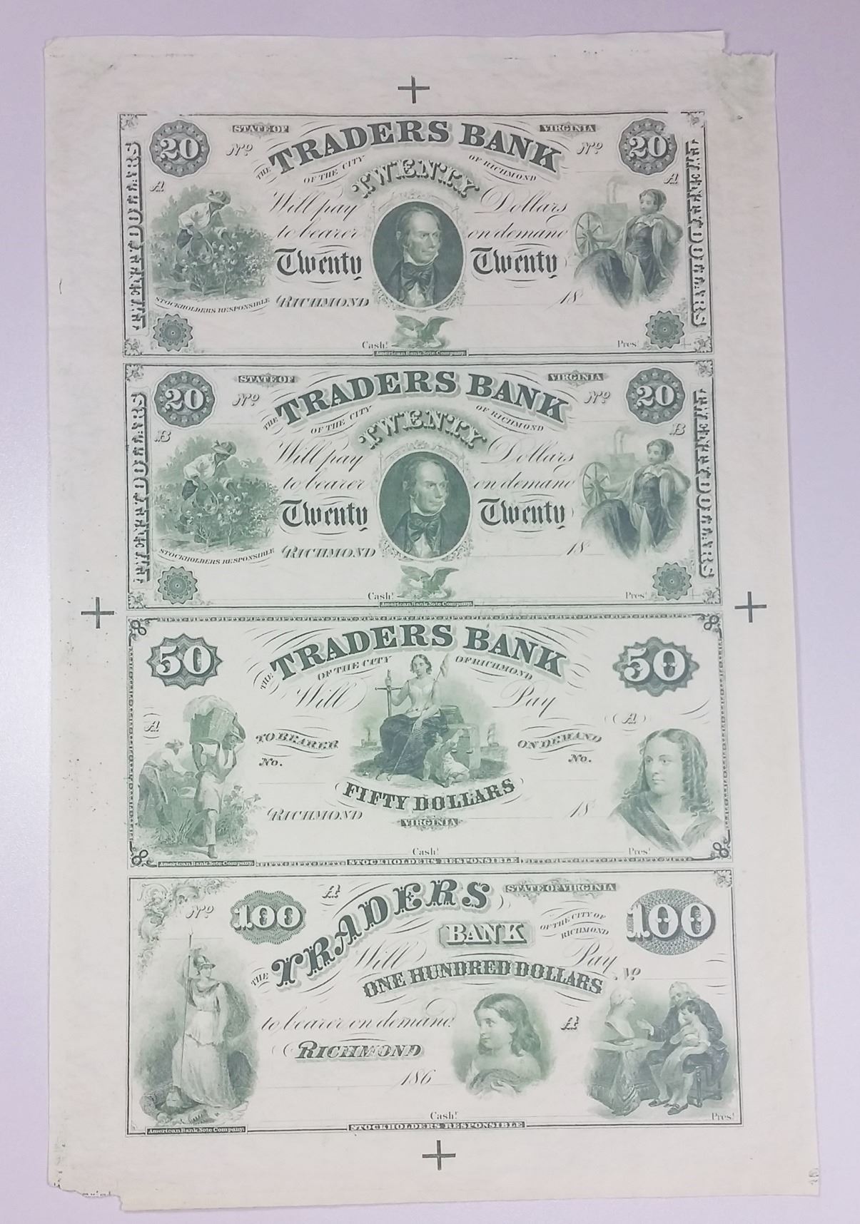 UNCUT SHEET OF 4 CIVIL WAR VIRGINIA NOTES. SHEET INCLUDES (2) $20, $50, & $100 TRADERS BANK OF RICHMOND, BEAUTIFUL! ESTIMATE: $200.-$300.00