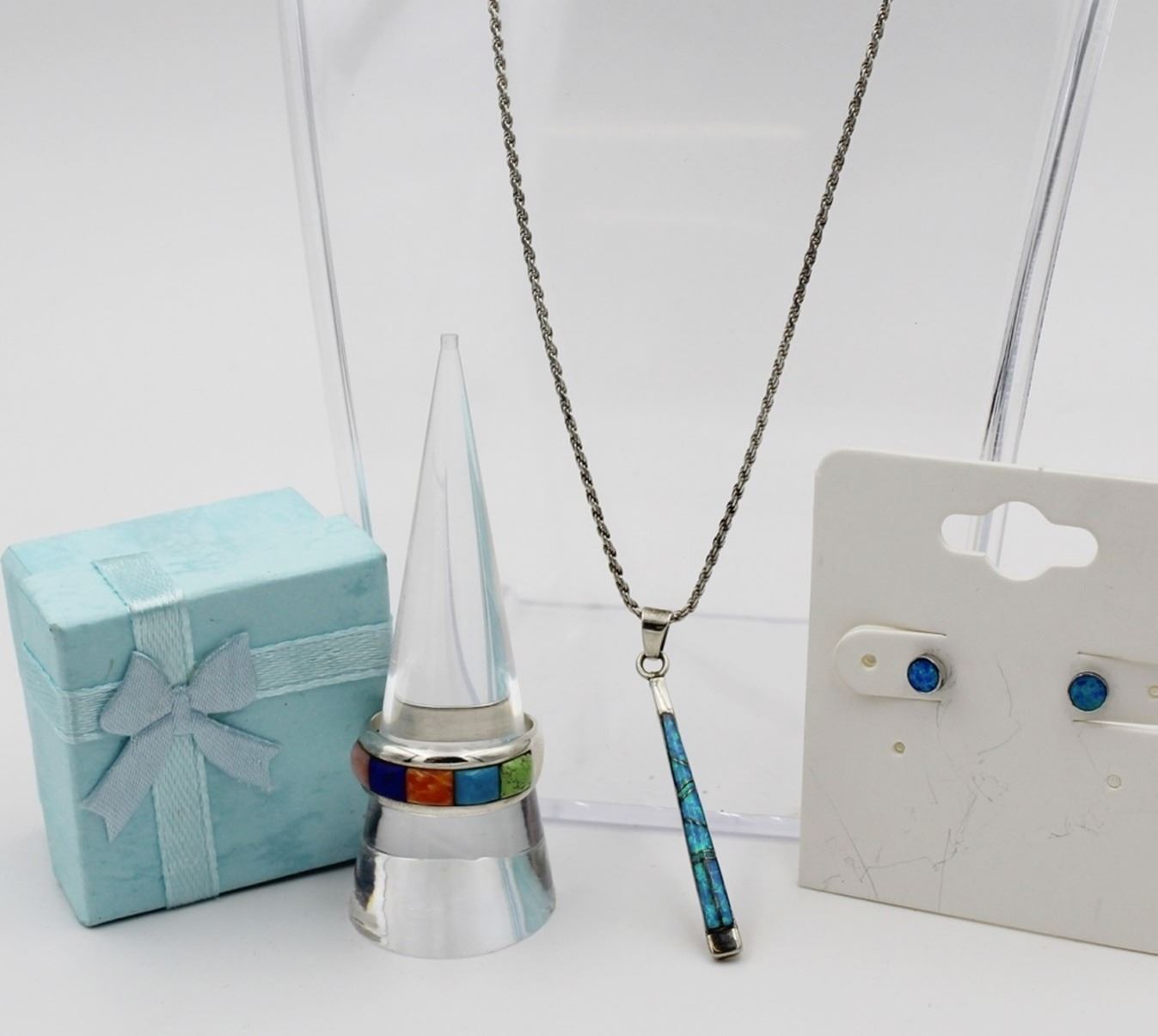 PENDANT IS REVERSIBLE WITH BEAUTIFUL ENAMEL COLORS ON ONE SIDE AND BLUE OPAL ON THE OTHER SIDE. RING HAS THE MATCHING ENAMEL COLORS AND IS A SIZE 9. ALSO COMES WITH PAIR OF EARRINGS FOR PIERCED EARS THAT ARE BLUE OPAL.