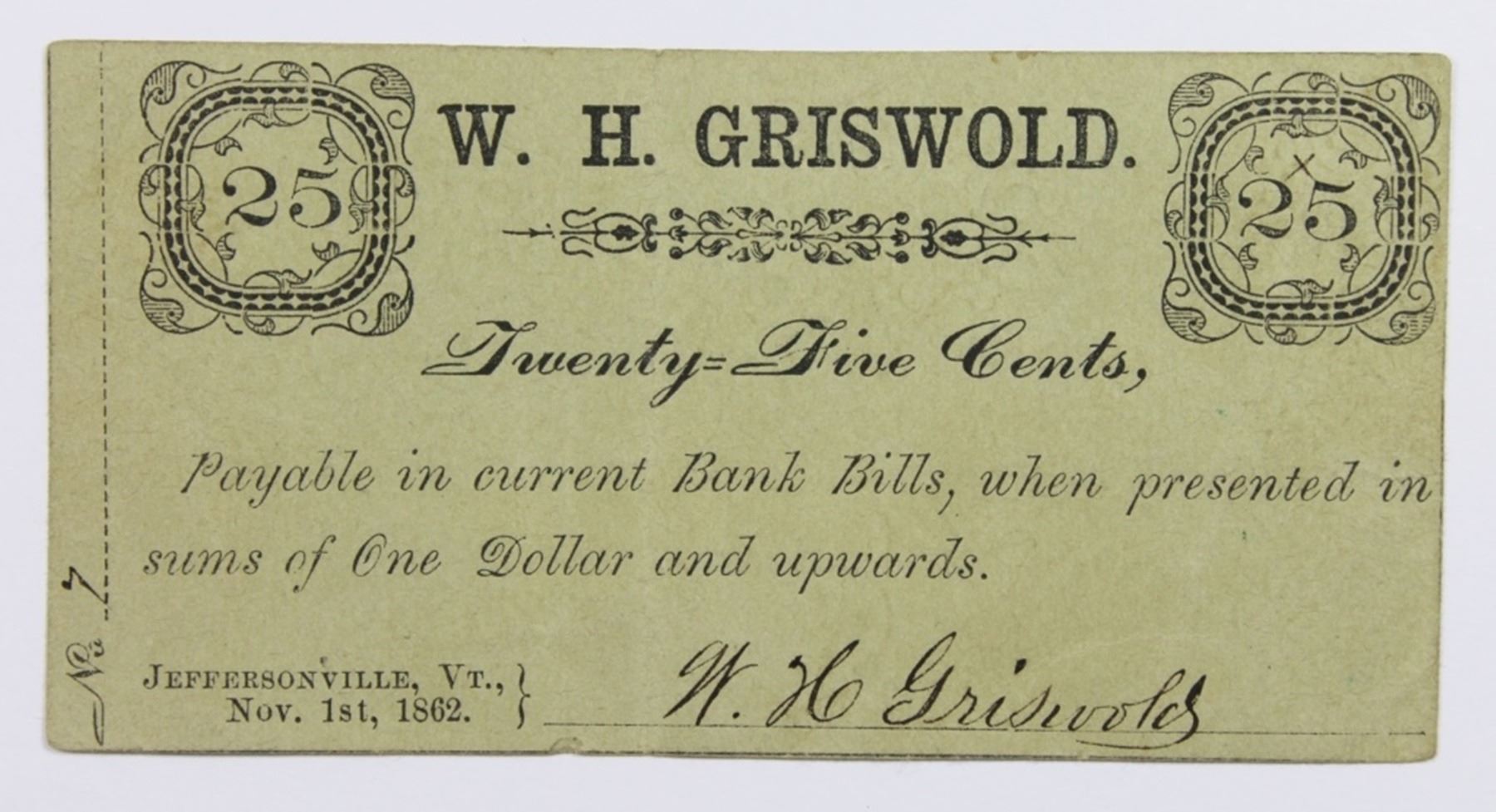 GREEN OVERPRINT. JEFFERSONVILLE, VERMONT. XF. FANCY DESIGN REVERSE. A FEW LT. STAINS. ESTIMATE: $300-$350