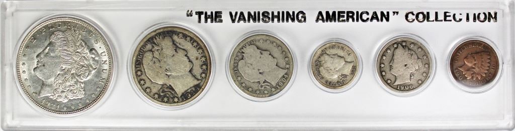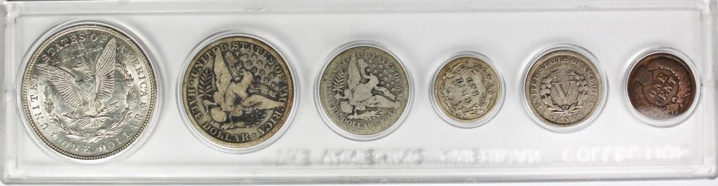 1921-D DOLLAR BU; 1914-S HALF DOLLAR VG; 1904-D QUARTER G; 1911 DIME VF; 1906 NICKEL G; AND 1902 CENT VG. ESTIMATE: $85-$115