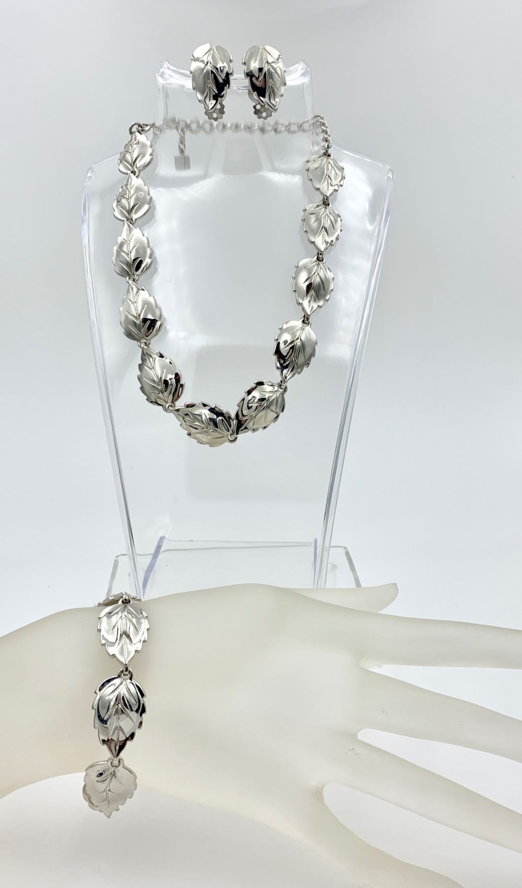 VINTAGE JEWELRY SET WITH SILVER TONE CLIPBACK EARRINGS, BRACELET AND NECKLACE